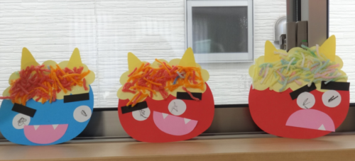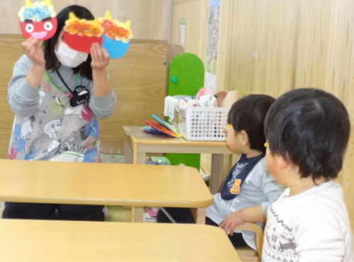 「オニ」と聞いて『やっつける!!』と張り切る子もいれば、そのWordだけで『怖い💦』となる子もいます。それでも、制作は楽しみな様子。本日は1歳児の製作の様子を紹介します。