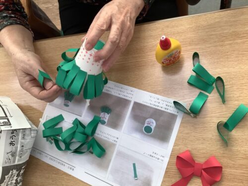 デイケアでは、クリスマスツリーを作成しました。