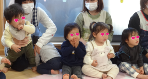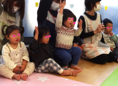 「にんじんさん、さくらんぼさん🎵」と保育者と一緒に手遊びを楽しむ子どもたち。
