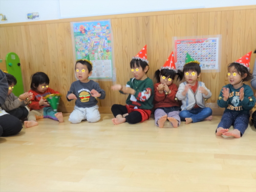 お誕生日のお友だちをみんなで「おめでとう~!」とお祝いしてから、クリスマス会のはじまりはじまり~!🎄