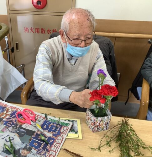 お花はスターチス・カーネーション・雪やなぎです。『どのお花を中心にしようかな』『雪やなぎって硬いのね』などお話しながら楽しく制作していました。