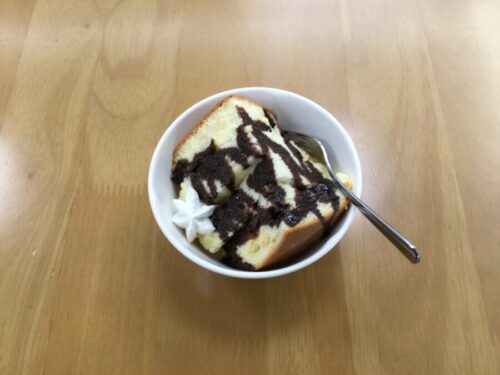おやつはふわふわの台湾カステラにホイップ&チョコソースでバレンタインのおやつを楽しんでいただきました🥰