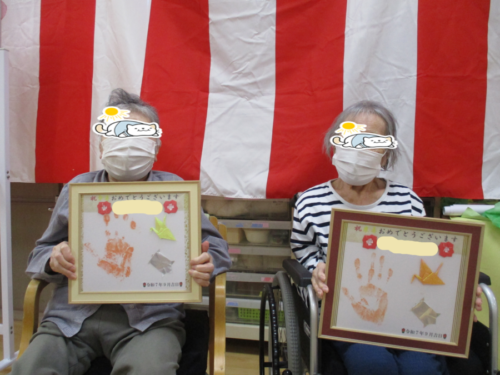 職員手作りの記念品(写真と手形)を贈呈し、満面の笑みで喜びを表現された賀寿の利用者様です。