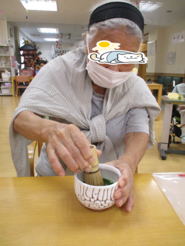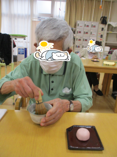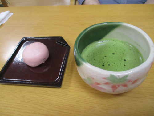 お祝いのおやつは寿饅頭とできたてのお抹茶です。