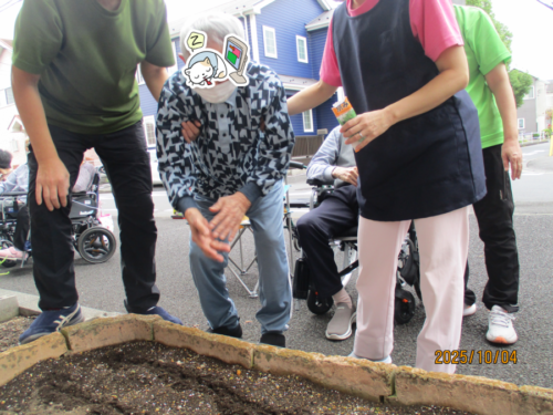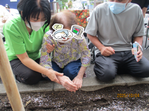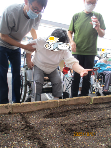 10月4日、利用者様とロベリア農園にほうれん草水菜ブロッコリーの種をまきました。