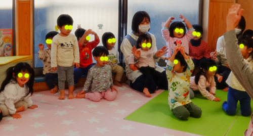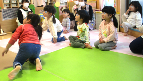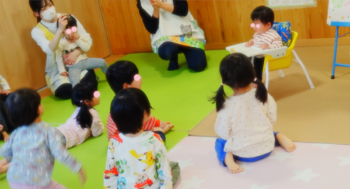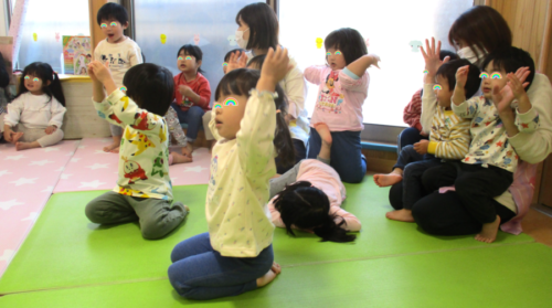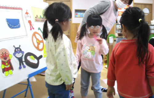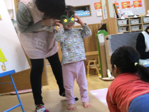 司会の保育者が「つけてみたい人?」と聞くとたくさんの手が挙がりました✋