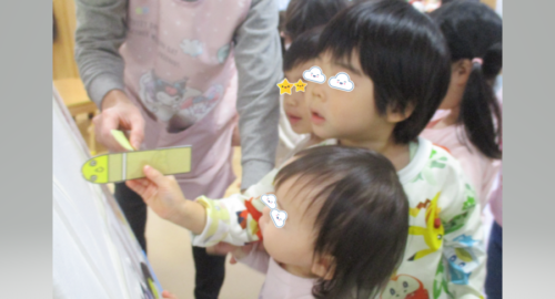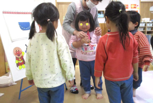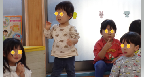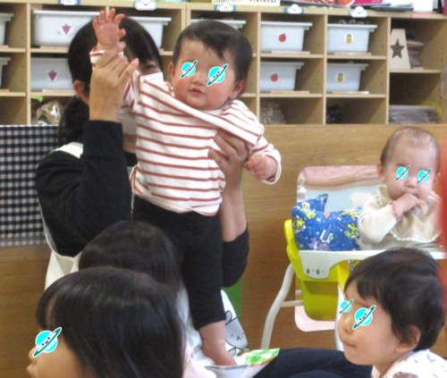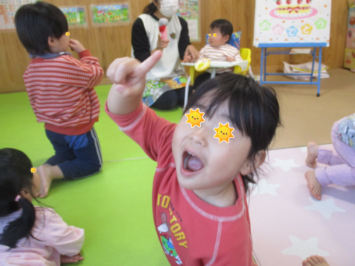 担任保育者が代わりに1歳になったことを伝えると、見守っていたお兄さんお姉さんは『1』の指を作り「1歳になったんだって!」と嬉しそうです♪