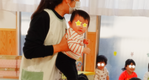 お名前を呼ばれて保育者に抱っこされるとカメラ目線でニヤリ。