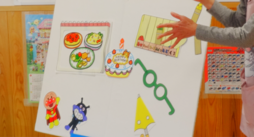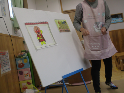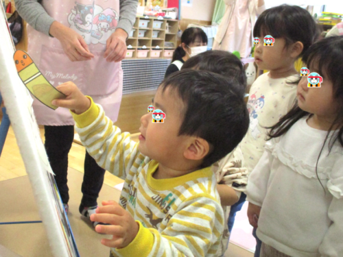 主役のお友だちの紹介が終わり、次は保育者からのプレゼント『へんしんクレヨン』のパネルシアターを見ました。