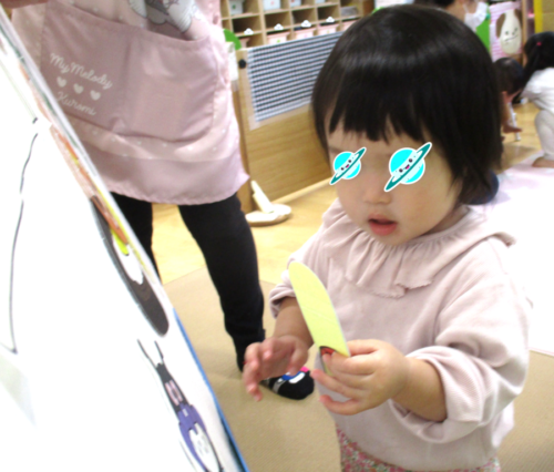 「かけてみたいお友だちはいるかな?」という司会者の声に、うさぎ組さんの子が前に出てきて嬉しそうにかけていました👀