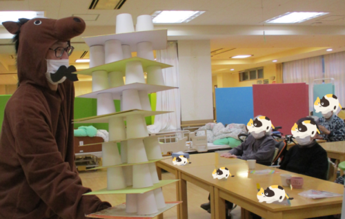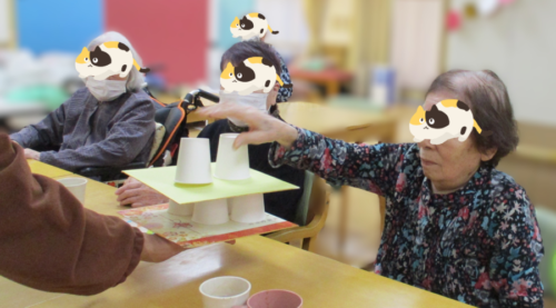 色紙と紙コップを交互に置いて、高~く積み上げていきます。紙コップは利用者様に積み上げていただきました。