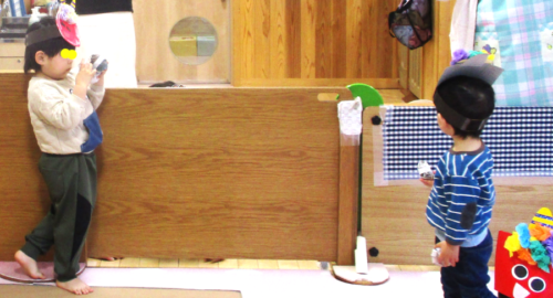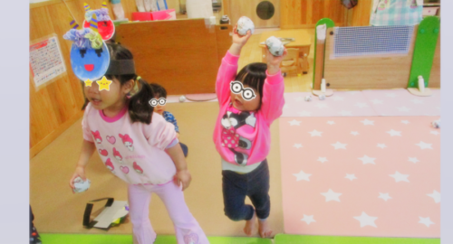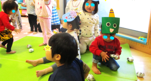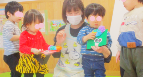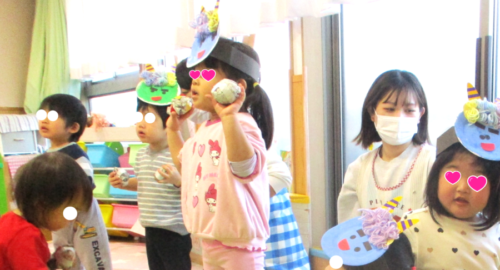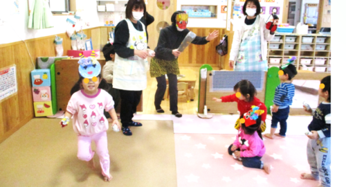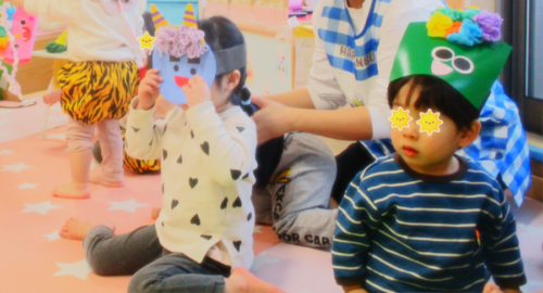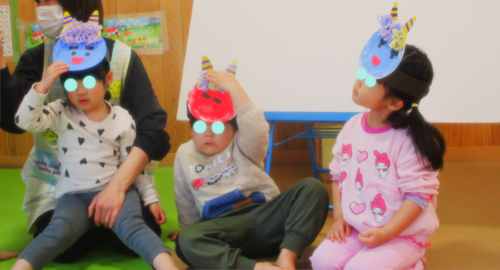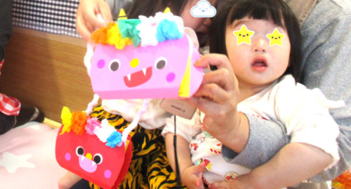 自分たちで作った鬼のお面がかっこいい1,2歳児さん。