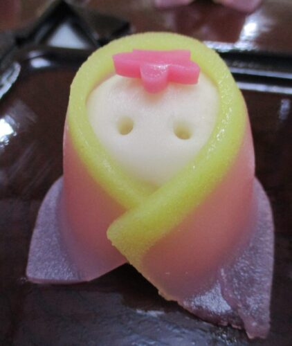 おやつは春色の着物をまとった女雛の練りきりです。